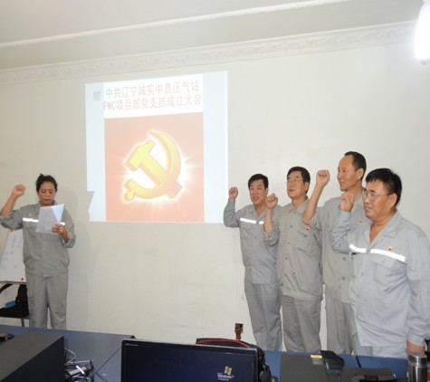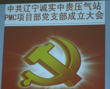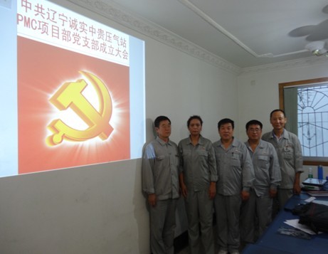2013年7月21日遼寧誠(chéng)實(shí)中貴線壓氣站PMC項(xiàng)目部黨支部成立大會(huì)正式召開,大會(huì)由公司黨委委員趙樹環(huán)同志主持,首先介紹了了黨支部成立的意義和目的,然后進(jìn)入了大會(huì)流程。通過(guò)全體黨員民主評(píng)議、選舉,盛孝福同志當(dāng)選為PMC項(xiàng)目部黨支部書記,師興華同志當(dāng)選為黨支部組織委員,胡德林同志當(dāng)選為黨支部宣傳委員,趙樹環(huán)同志代表公司黨委對(duì)黨支部成立表式祝賀。黨支部全體黨員在黨旗下進(jìn)行了鄭重宣誓,最后由黨支部書記作表態(tài)發(fā)言。