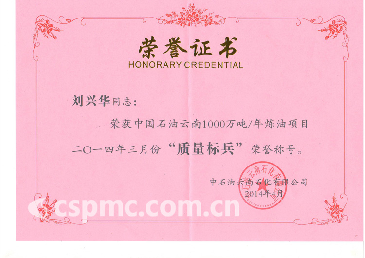 熱烈祝賀劉興華同志榮獲中國石油云南1000萬噸/年煉油項目2014年3月份“質(zhì)量標兵”榮譽稱號!